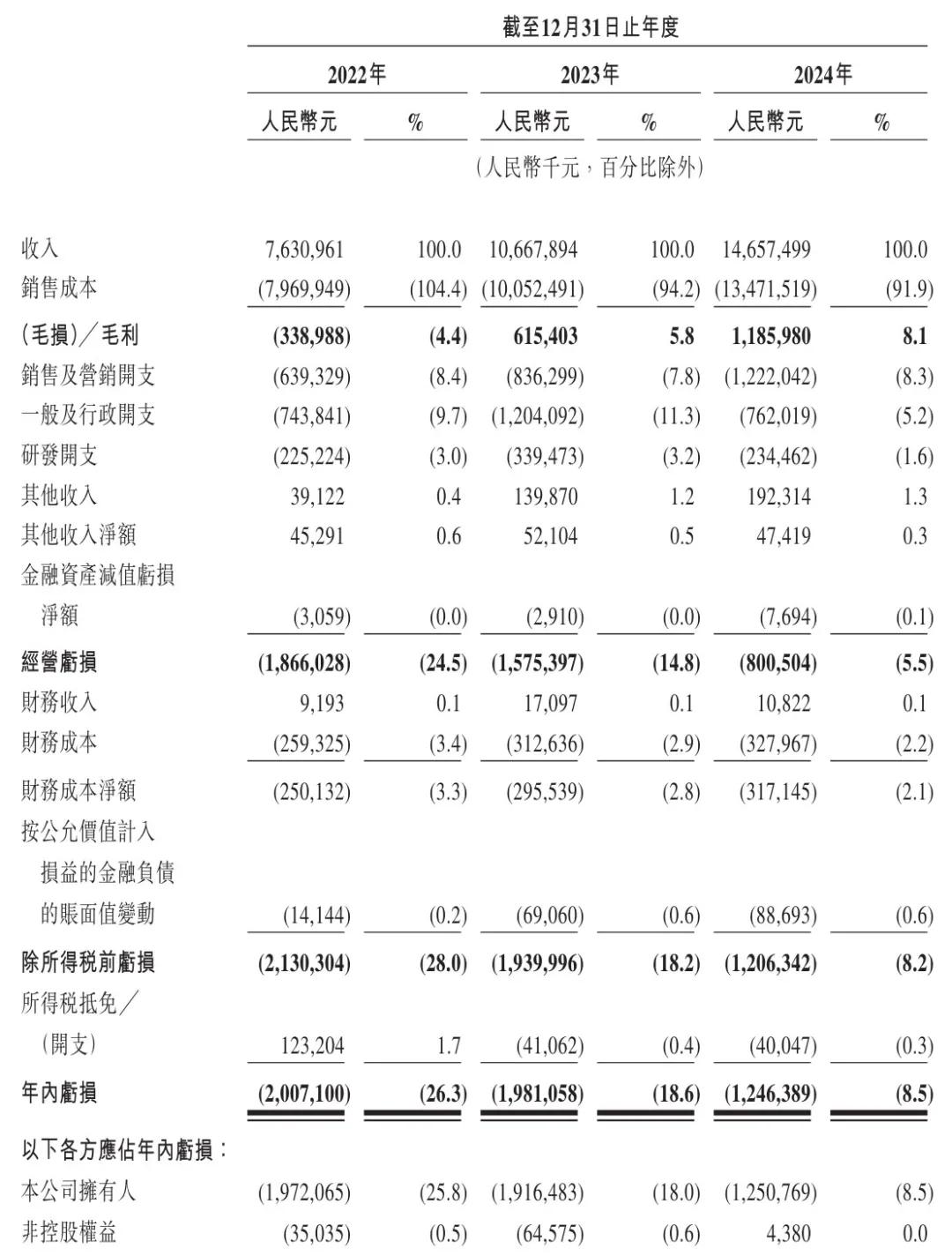 2022-2024年間,曹操出行的運營虧損分別為18.66億、15.75億、8億;經營虧損率分別為24.5%、14.8%、5.5%;年內虧損分別為20.07億、19.81億、12.46億;年內虧損率分別為26.3%、18.6%、8.5%。