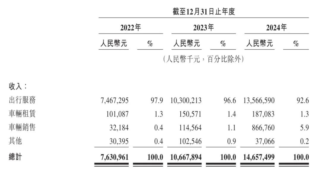曹操出行的業務包含出行服務、車輛租賃、車輛銷售及其他。在2024年,曹操出行2024年來自出行服務的收入為135.67億元,佔營收的比例為92.6%;來自車輛租賃收入為1.87億元,佔比為1.3%;來自車輛銷售的收入為8.67億元,佔營收的比例為5.9%。