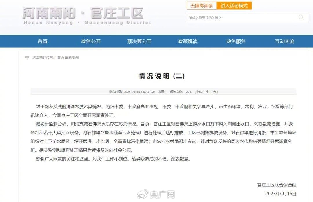 對於網友反映的澗河水質污染情況,南陽市委、市政府高度重視,市委、市政府相關領導牽頭,市生態環境、水利、農業、紀檢等部門迅速介入,會同官莊工區全面開展調查處理。