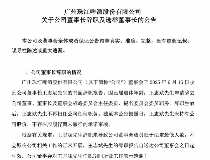 6月16日,廣州珠江啤酒股份有限公司(股票代碼:002461.SZ)發佈公告,董事會於當日收到公司董事長王志斌的書面辭職報告。因已屆退休年齡,王志斌申請辭去公司董事、董事長及董事會戰略委員會主任委員、提名委員會委員職務。