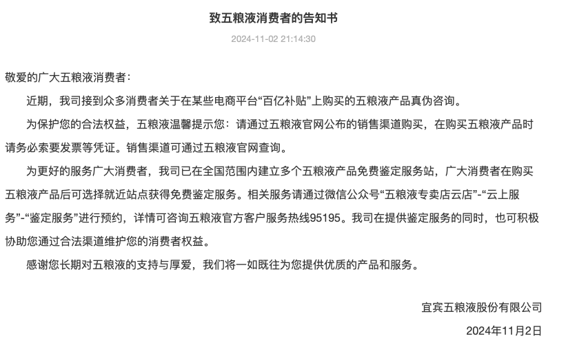 緊隨其後的11月2日,五糧液再次發佈《致消費者的告知書》表示最近接到眾多消費者關於在某些電商平台“百億補貼”上購買的五糧液產品真偽諮詢,建議消費者通過五糧液官網公佈的銷售渠道購買。