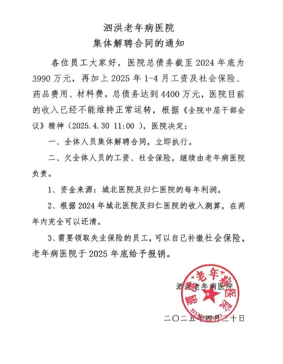 這則名為《泗洪老年病醫院集體解聘合同的通知》中稱,醫院總債務截至2024年底為3990萬元,再加上2025年1至4月工資及社會保險、藥品費用、材料費,總債務達到4400萬元,醫院目前的收入已經不能維持正常運轉。醫院決定:全體人員集體解聘合同,立即執行,欠全體人員的工資、社會保險,繼續由老年病醫院負責。