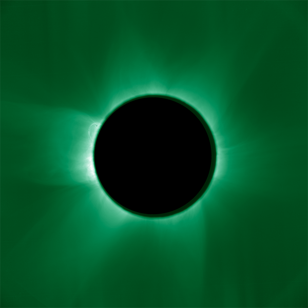 第二張圖像的日冕被人工着色為深綠色,它顯示了日冕綠線中的觀測結果。日冕綠線是鐵原子發射的光譜線,它們在極高的温度中失去了一半的電子。ESA稱,這使得人們可以觀察到日冕中温度最高的部分。