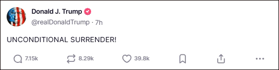 當天下午,特朗普用全大寫字母呼籲伊朗“無條件投降!”。