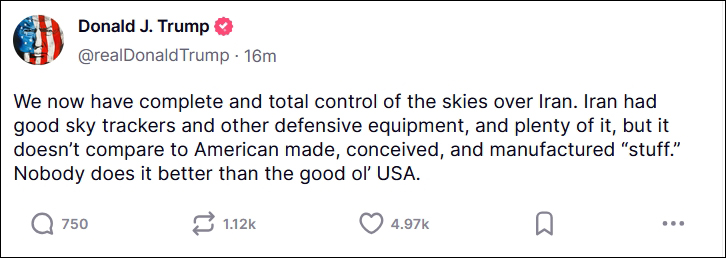 當地時間17日中午時分,特朗普在其自創社交媒體Truth Social上發文稱,“我們現在完全掌控了伊朗的領空”。“伊朗擁有性能優良的空中追蹤器和其他防禦設備,而且數量還不少,但這些都比不上美國製造、構思和生產的“東西”。在這方面,沒有人比美國做得更好。”