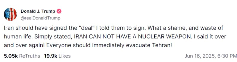 但此後,特朗普又在Truth Social上發文説,“伊朗本應簽署我讓他們籤的協議!”“簡單地説,伊朗不能擁有核武器!”“所有人都應立即撤離德黑蘭!”對此,他沒有作進一步解釋和説明。