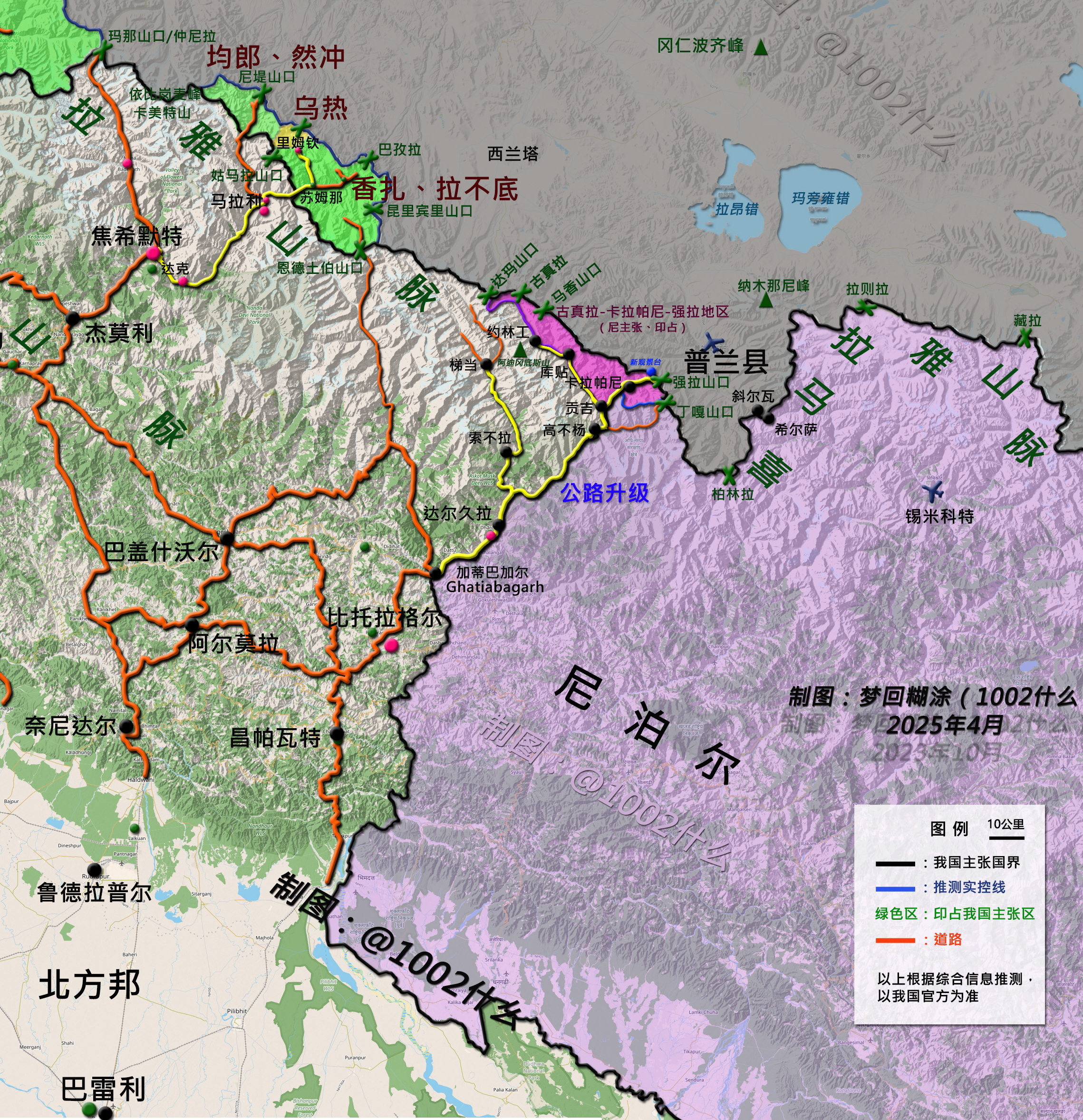 圖中深紫色區域為尼泊爾主張、印度強佔的卡拉帕尼地區,為回應印度在當地修建公路,尼泊爾政府於2020年、2024年分別在新版官方地圖、新版紙幣中將其包含在本國領土內。 製圖:微博賬號@1002什麼