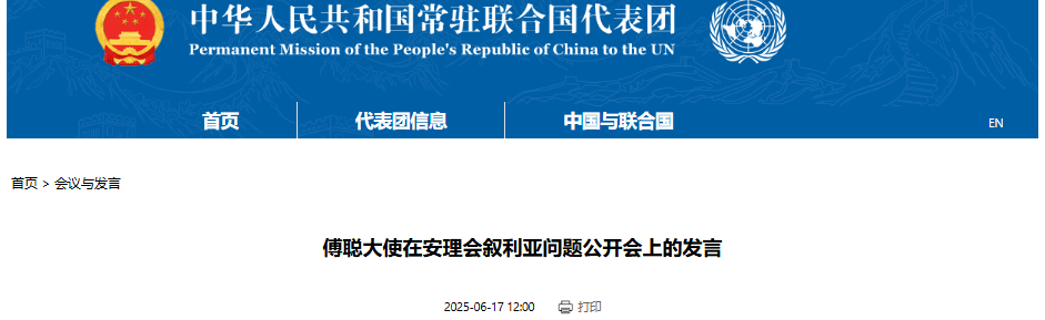 據中國常駐聯合國代表團網站消息,6月17日,中國常駐聯合國代表傅聰在安理會敍利亞問題公開會上發言,敦促敍利亞臨時當局切實履行反恐義務,採取一切措施打擊所有盤踞在敍的恐怖勢力,譴責以色列侵犯伊朗的主權、安全和領土完整。