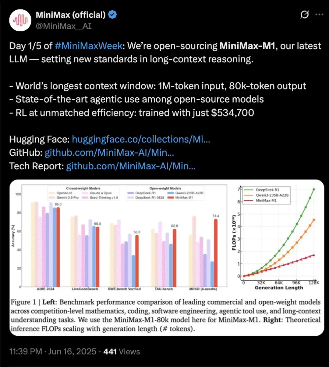 MiniMax6月17日宣佈將連續五天發佈重要更新。今天第一彈是開源首個推理模型MiniMax-M1。根據官方的報告,MiniMax-M1多項基準測試比肩DeepSeek-R1、Qwen3等開源模型,接近海外的最領先模型。官方博客還提到,基於兩大技術創新,MiniMax-M1訓練過程高效得“超出預期”,只用了3周時間、512塊H800 GPU就完成強化學習訓練階段,算力租賃成本僅53.47萬美元。這比一開始的預期少了一個數量級。(財聯社)