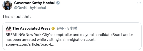 美國紐約州州長凱西·霍赫爾在社交平台上轉發了蘭德被逮捕的相關報道,稱“這是扯淡”。她還發文稱,“自己將對抗美國總統特朗普政府,保護合法進入美國的移民”。