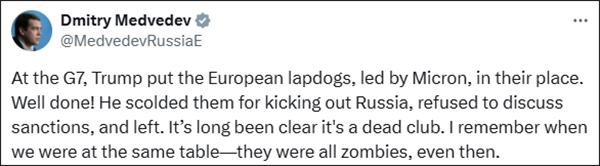 梅德韋傑夫寫道:“在G7峯會上,特朗普讓以法國總統馬克龍為首的歐洲走狗認清了自己的位置。做得好!他斥責他們把俄羅斯趕走,拒絕討論制裁問題,然後離開了。”