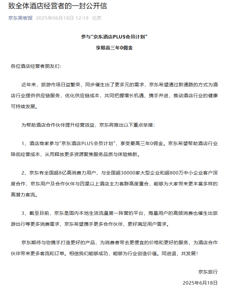 最高三年零佣金,京東發佈《致全體酒店經營者的一封公開信》
