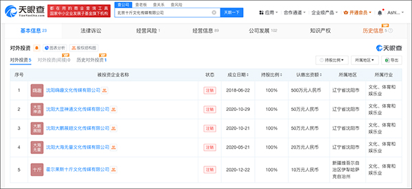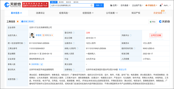 天眼查App顯示,北京十斤文化傳媒有限公司成立於2019年4月,法定代表人為李雪陽,註冊資本10萬人民幣,經營範圍包括演出經紀、音像製品製作、銷售食品等,由上海酥年文化藝術策劃合夥企業(有限合夥)、寧波唯獵投資管理合夥企業(有限合夥)共同持股,該公司已於2022年6月註銷。對外投資信息顯示,該公司全資持股5家企業,4家成立於2020年,1家成立於2018年,目前均已註銷。