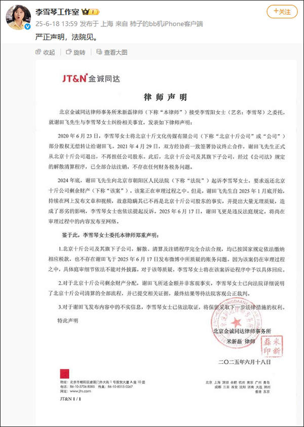 律師聲明中稱,北京十斤文化傳媒有限公司及其旗下子公司解散、清算及註銷程序完全合法合規,均已按國家規定依法繳納相應税款,也不存在謝田飛於2025年6月17日發佈微博中所質疑的賬務問題。