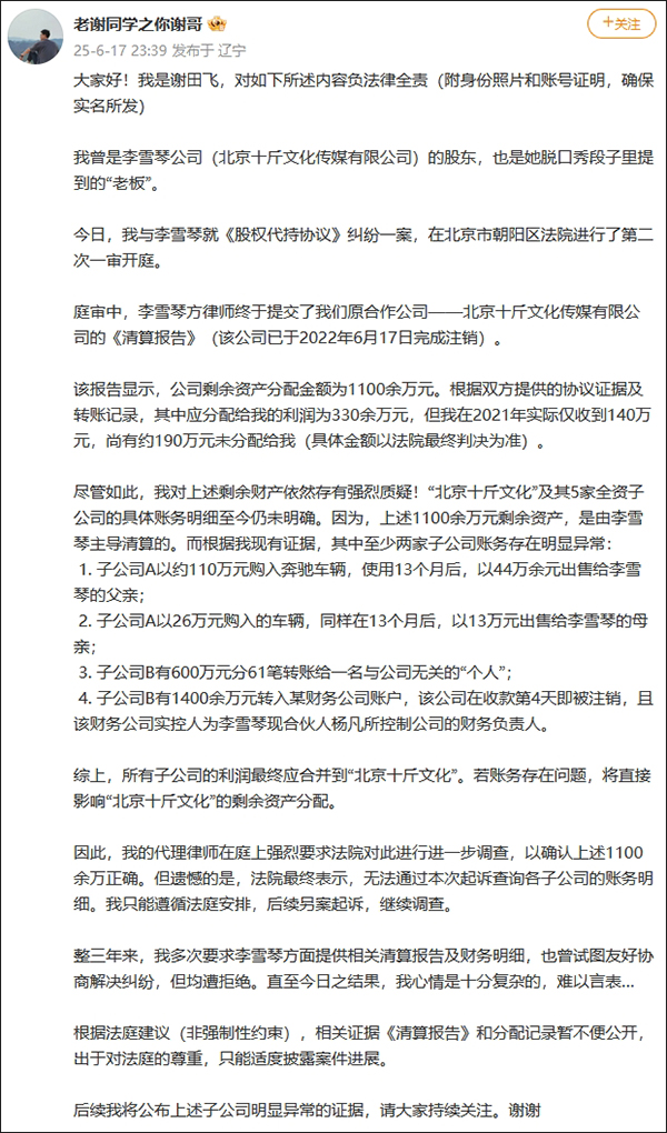 6月17日晚間,@老謝同學之你謝哥 發佈微博,自稱“曾是李雪琴公司(北京十斤文化傳媒有限公司)的股東”,實名舉報該公司財務問題。