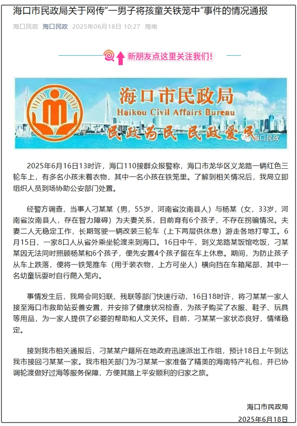 2025年6月16日13時許,海口110接羣眾報警稱,海口市龍華區義龍路一輛紅色三輪車上,有多名小孩未着衣物,其中一名小孩在鐵籠裏。瞭解到相關情況後,我局立即組織人員到場協助公安部門處置。