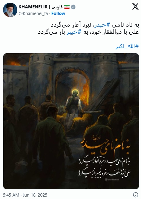 “阿里將帶着他的寶劍‘佐勒菲卡爾’,重返海巴爾。”哈梅內伊在帖文中寫到。哈梅內伊引用的是什葉派的第一位伊瑪目阿里的典故,後者曾在公元7世紀征服了猶太人的城鎮海巴爾,而“佐勒菲卡爾”則是伊斯蘭教先知穆罕穆德賜予阿里的寶劍。