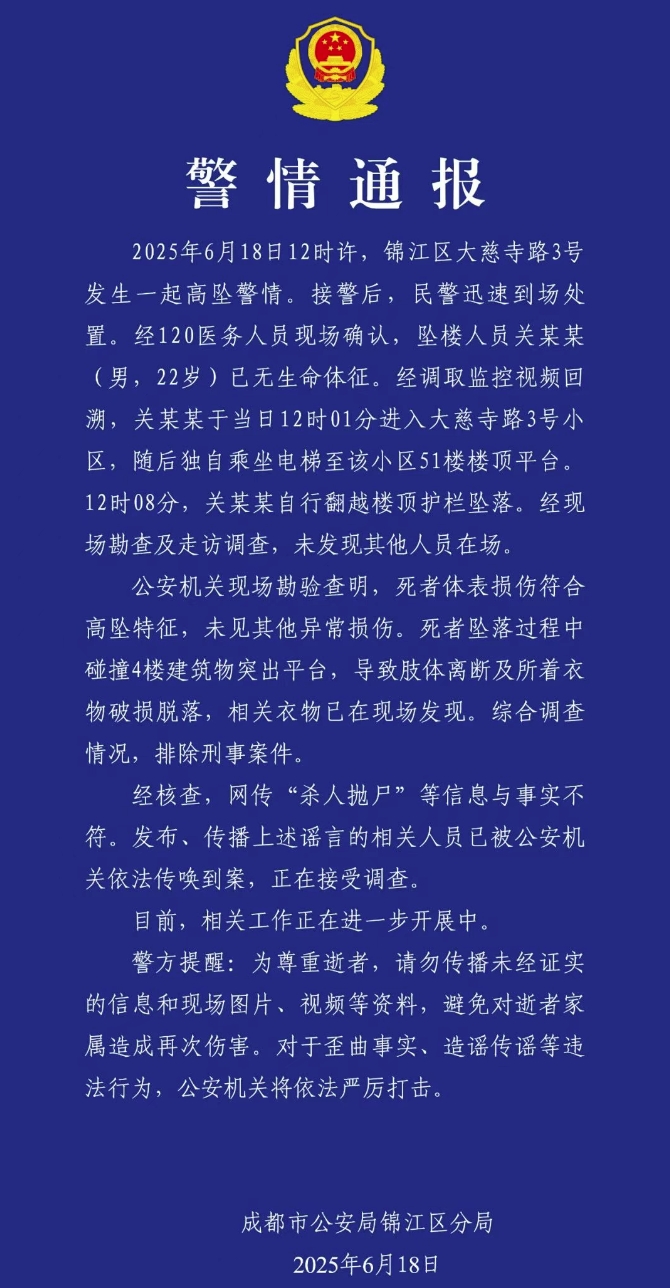 微信公眾號“成都錦江公安”6月18日發佈警情通報稱,6月18日12時許,錦江區大慈寺路3號發生一起高墜警情。接警後,民警迅速到場處置。經120醫務人員現場確認,墜樓人員關某某(男,22歲)已無生命體徵。經調取監控視頻回溯,關某某於當日12時01分進入大慈寺路3號小區,隨後獨自乘坐電梯至該小區51樓樓頂平台。12時08分,關某某自行翻越樓頂護欄墜落。經現場勘查及走訪調查,未發現其他人員在場。