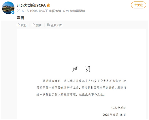 @江蘇大劇院JSCPA 6月18日發佈聲明稱,針對近日我司一名工作人員在其個人社交平台發表不當言論,我司已於第一時間停止其所有工作,並按照相關規定予以辭退。劇院將進一步強化工作人員教育管理,杜絕此類事件發生。