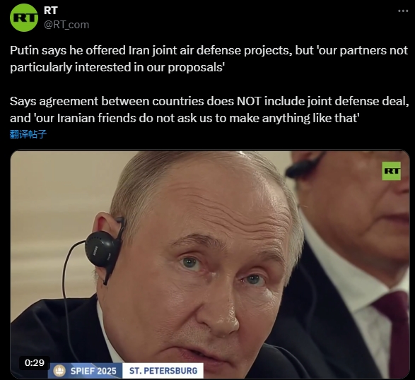 【文/觀察者網 齊倩】據俄新社和路透社報道,當地時間6月18日,俄羅斯總統普京在聖彼得堡會見各國媒體代表時,拒絕討論以色列和美國刺殺伊朗最高領袖哈梅內伊的可能性,並稱伊朗沒有提出任何正式的武器供應請求。他還提到,俄方曾提出與伊朗合作研製防空系統,但伊朗“不太感興趣”。