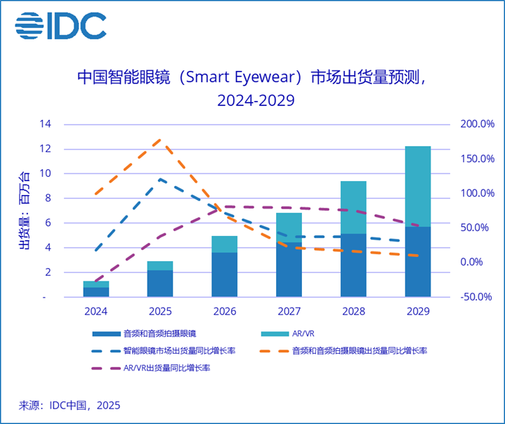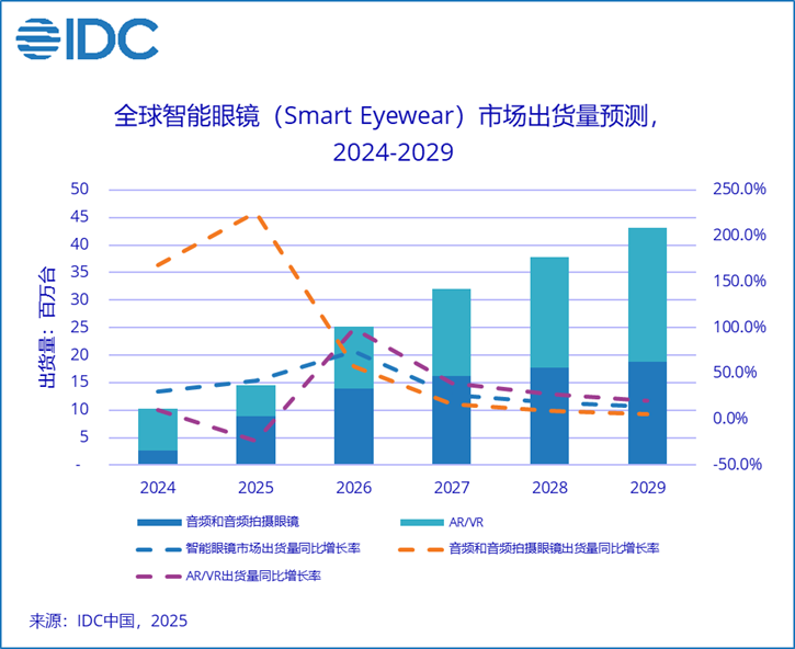 IDC預計,2025年全球智能眼鏡(Smart Eyewear)市場出貨量達到1451.8萬台,同比增長42.5%,其中音頻和音頻拍攝眼鏡出貨量預計882.8萬台,同比增長225.6%;AR/VR設備出貨量預計569.0萬台,同比下降23.9%。其中AR/VR市場的下滑主要受到MR市場影響,由於重要廠商產品節奏的停滯或推後,部分出貨將從2025年延後至2026年。