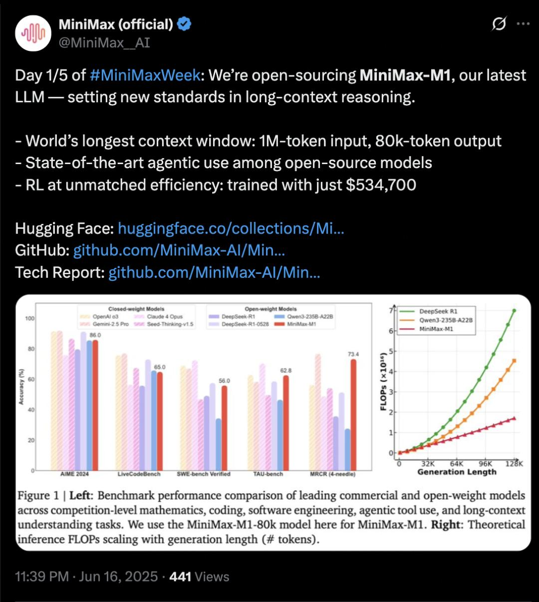 在該消息傳出的前一天,也就是6月17日,MiniMax發佈世界上第一個開源的大規模混合架構的推理模型MiniMax-M1。
