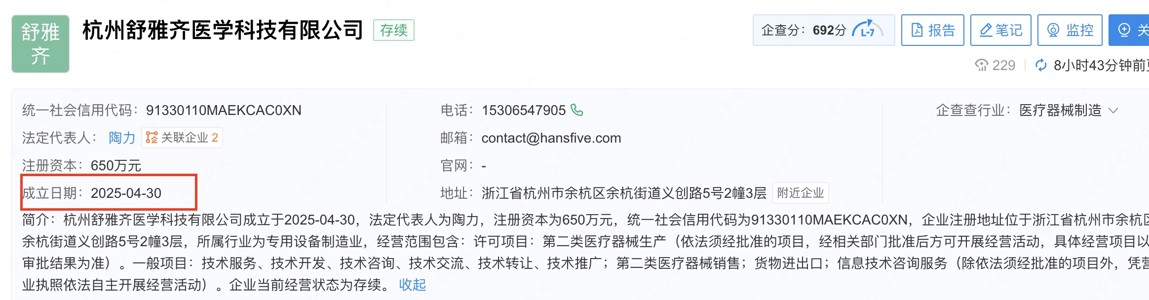值得注意的是,舒雅齊成立時間僅一個半月——天眼查信息顯示其成立於2025年4月30日,系漢斯夫旗下新拆分正畸業務實體。