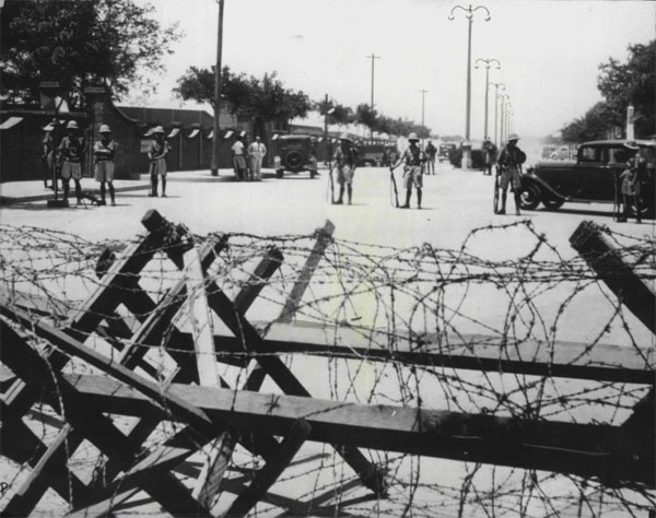 1939年6月,英軍士兵在日軍豎起的路障後 wiki
