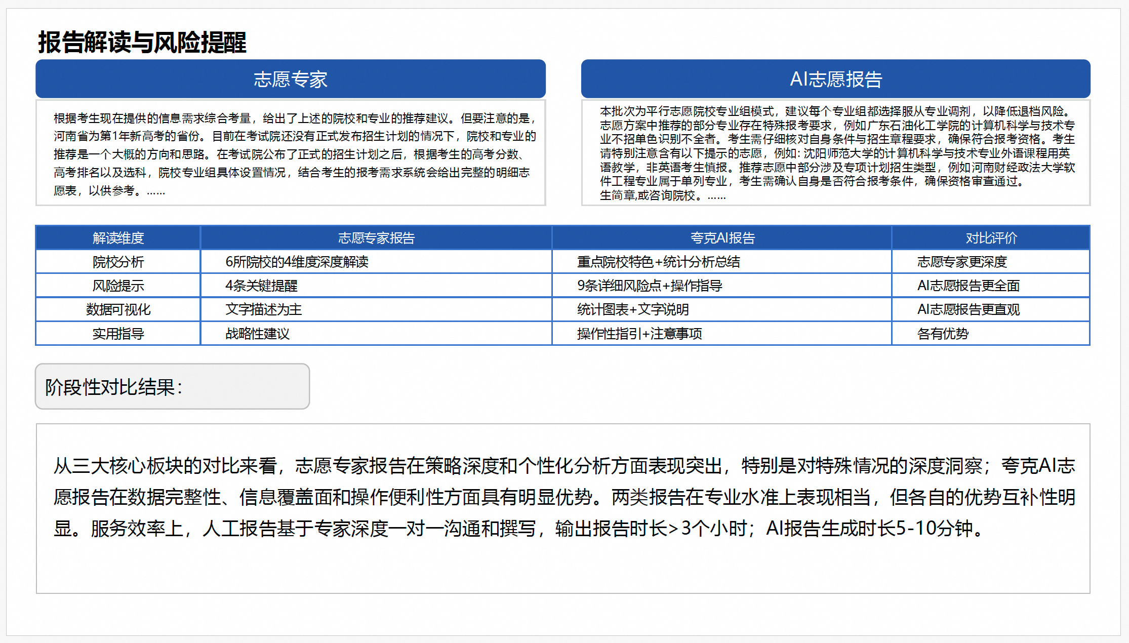 為客觀評估AI工具應用效果,清華大學團隊從志願填報策略設計、志願表明細、報告解讀與風險提醒三大核心維度,對人類志願專家報告與夸克生成的AI志願報告進行採樣對比。結果顯示,兩類報告在專業水準上表現相當。