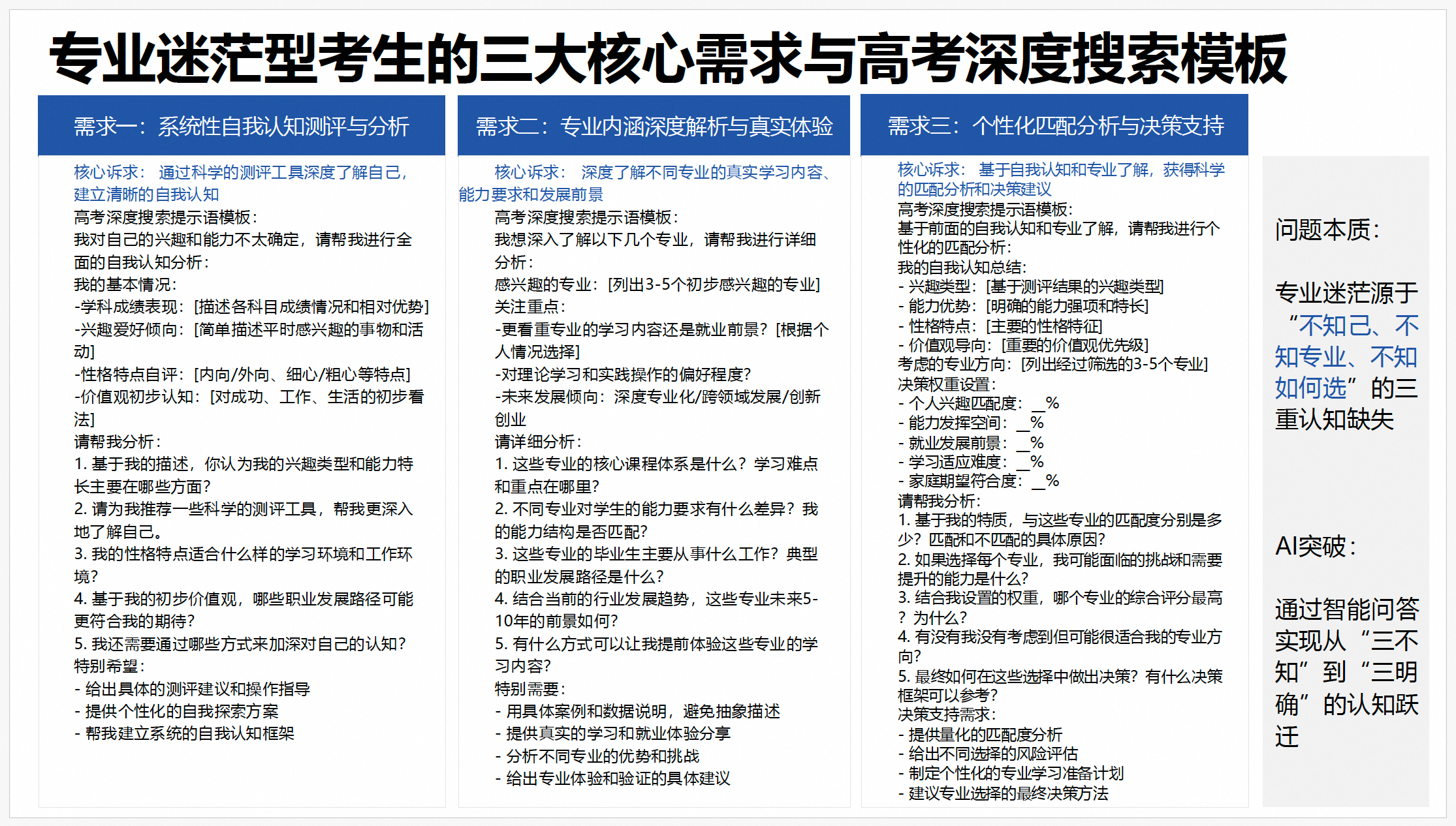 圍繞十大典型志願填報場景,《指南》提出了覆蓋高分考生、中等分數考生、低分考生、專業迷茫型考生、偏遠地區考生等不同羣體的AI輔助使用策略。“衝刺211但擔心滑檔怎麼辦?”、“如果只能上專科,哪些專業最實用?”、“孩子不知道適合什麼專業怎麼辦?”等問題,家長和考生都可以直接使用報告中設計的提示詞模版進行查詢,涵蓋了幾乎所有高考志願中的典型難題。
