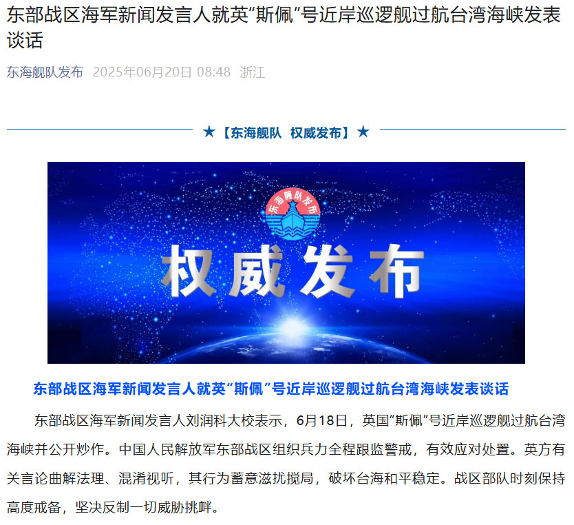 據海軍東海艦隊微信公眾號“東海艦隊發佈”6月20日消息,東部戰區海軍新聞發言人就英“斯佩”號近岸巡邏艦過航台灣海峽發表談話。