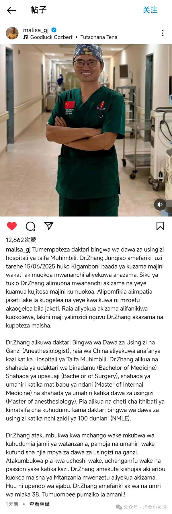 微信公眾號“坦桑小靈通”寫道,張醫生的離世,在坦桑尼亞社會引發強烈反響。擁有逾73萬粉絲的知名公益人士Godlisten Malisa(Instagram賬號:@malisa_gj)在社交平台發文悼念,詳細講述了張醫生捨己救人的英勇事蹟,並寫道:“張醫生用生命托起了一位坦桑尼亞民眾,也托起了中坦之間最珍貴的友誼。”Malisa的發聲迅速引發廣大網民的共鳴,眾多網友留言緬懷,稱他是“最值得尊敬的中國醫生”。