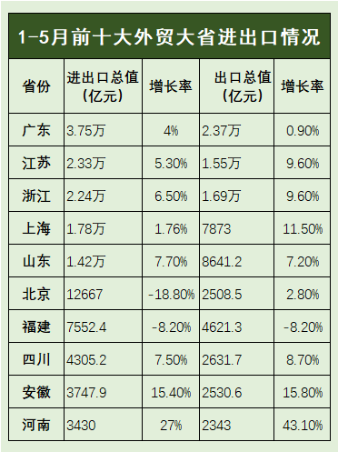 10大外貿省份前五月出口數據公佈:江蘇、浙江增9.6%,河南增43.1%,福建收窄至-8.2%