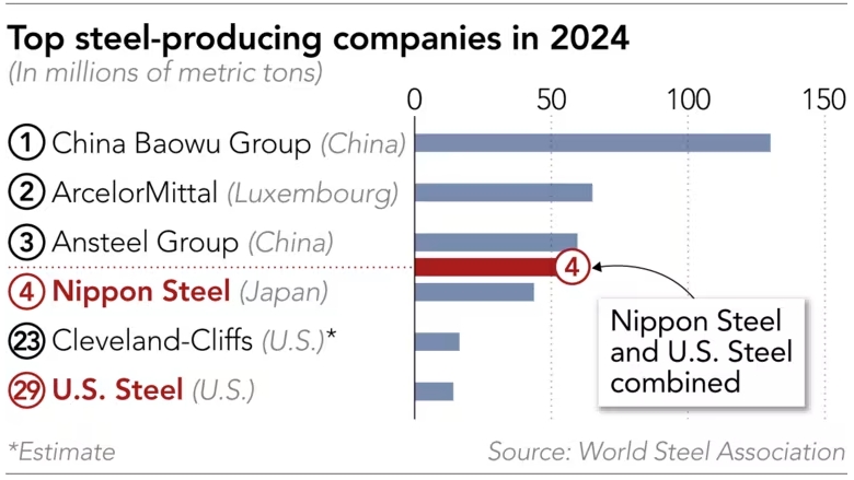 日鐵收購美鋼可謂是歷經波折。自2023年12月宣佈收購計劃後,在過去一年半時間內,日本製鐵公司為成功收購無所不用其極,甚至炒作“中國威脅”,聲稱這筆交易“將有助於應對中國競爭,增強美國國家安全”。但拜登政府反對這項收購案,特朗普上台後也表現得興致缺缺。