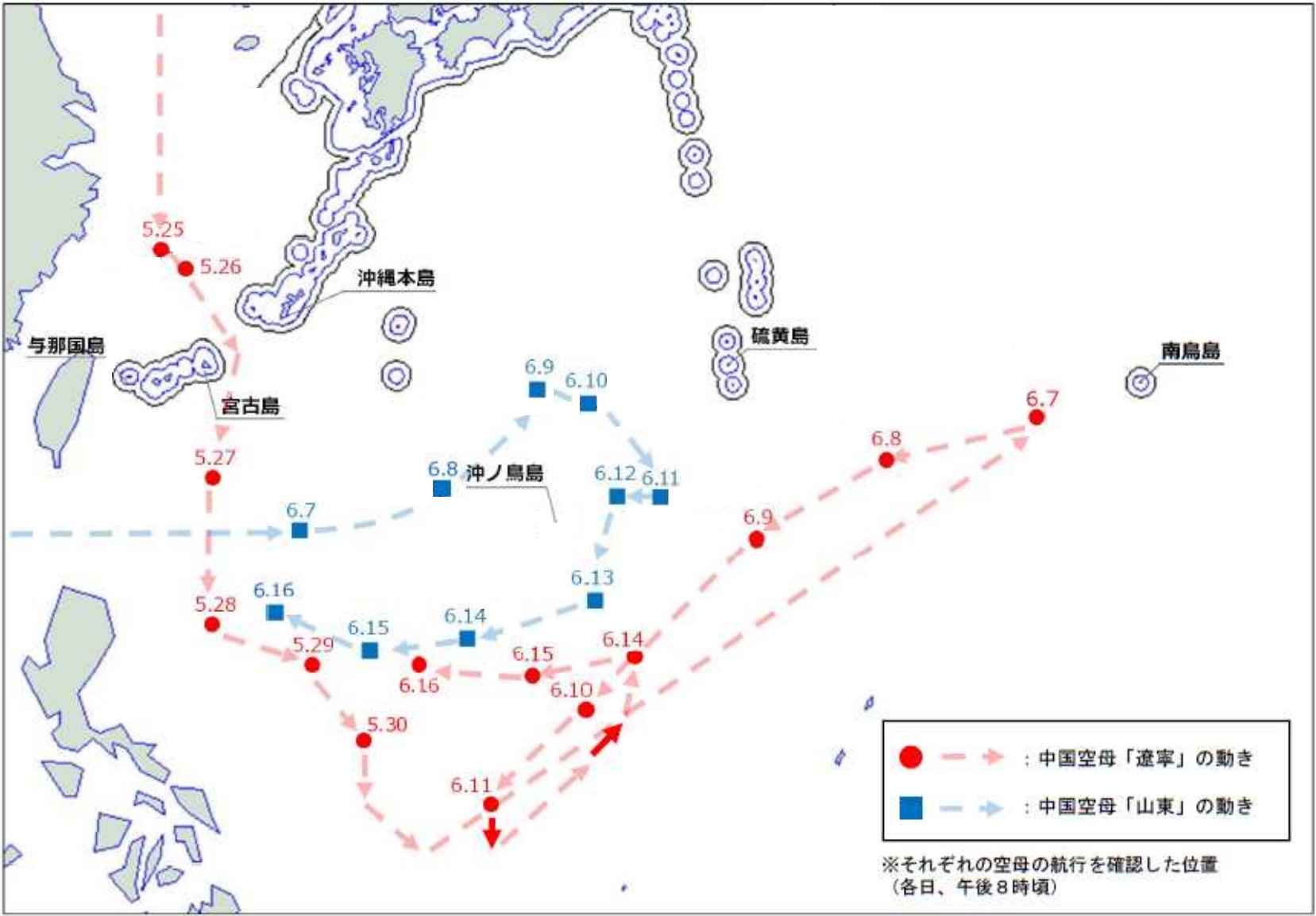 6月17日通報中所附帶日方觀測到的遼寧艦和山東艦編隊航跡示意圖 日本防衞省統合幕僚監部 下同