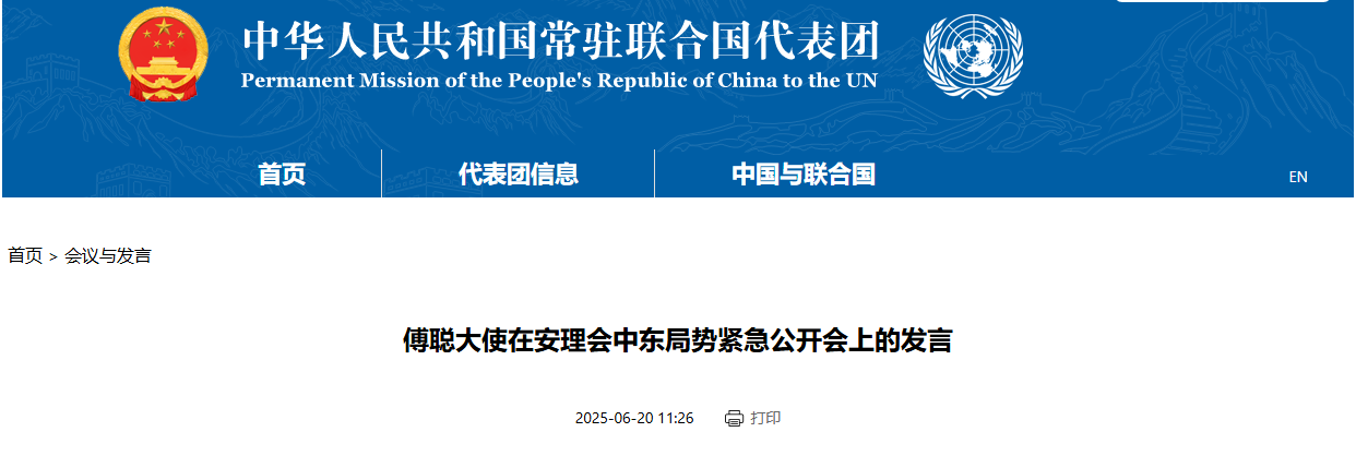 據中國常駐聯合國代表團網站消息,當地時間6月20日,傅聰大使在安理會中東局勢緊急公開會上發言,敦促國際社會全力勸和促談,平息緊張局勢。