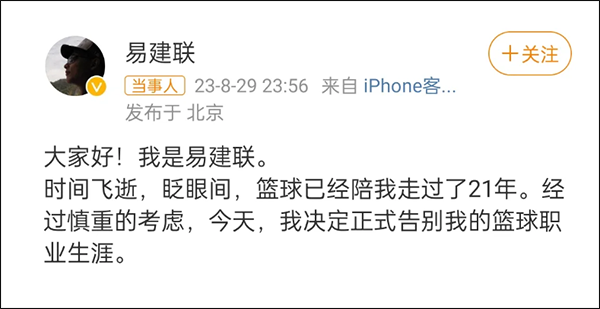 2023年8月29日晚,易建聯發佈微博,決定正式告別籃球職業生涯。
