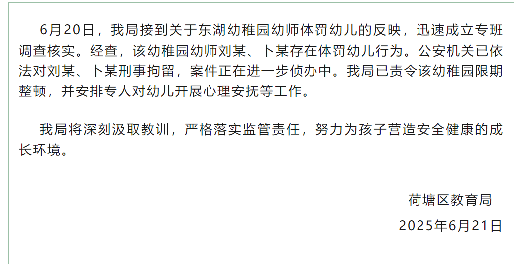 6月20日,湖南省株洲市荷塘區教育局接到東湖幼稚園關於幼師體罰幼兒的反映,迅速成立專班調查核實。經查,該幼稚園幼師劉某、卜某存在體罰幼兒行為。公安機關已依法對劉某、卜某刑事拘留,案件正在進一步偵辦中。
