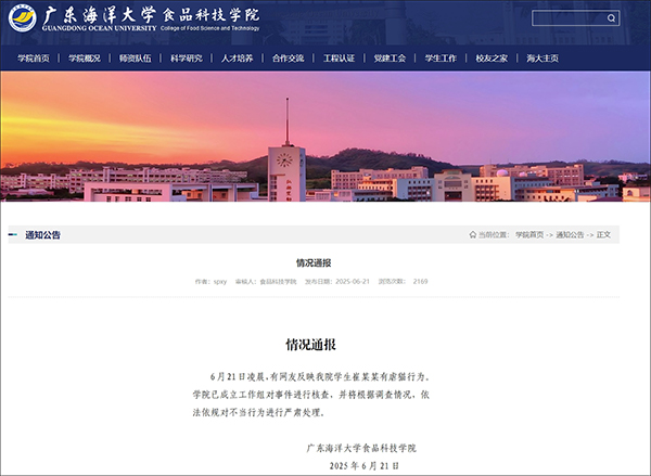廣東海洋大學:網友反映學生有虐貓行為,已成立工作組核查 guancha 2025-06-22 廣東海洋大學食品科技學院網站6月21日發佈情況通報稱,當天凌晨,有網友反映我院學生崔某某有虐貓行為。學院已成立工作組對事件進行核查,並將根據調查情況,依法依規對不當行為進行嚴肅處理。
