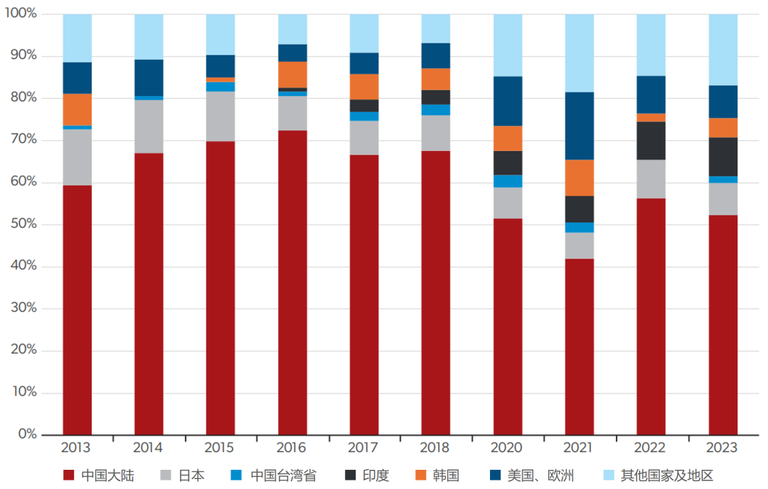 需特別説明,本節分析聚焦生產基地所在地,而非企業總部所在地。例如,日企在華工廠在此歸類為“中國大陸”。由於蘋果未公開各區域產能佔比數據,下文僅反映生產基地數量變化。