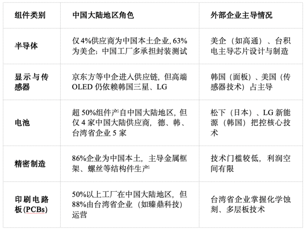 但報告同時指出,蘋果供應鏈的許多環節仍由跨國企業主導,呈現出“中國製造”與“外資控股”並存的特徵。在中國大陸地區設廠的中國台灣省企業、美企、日企仍然在多個關鍵領域保持主導地位,尚未被中國大陸地區企業所取代。