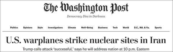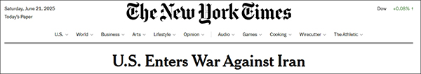《紐約時報》頭條標題寫道:“美國對伊朗開戰”(U.S. Enters War Against Iran)。