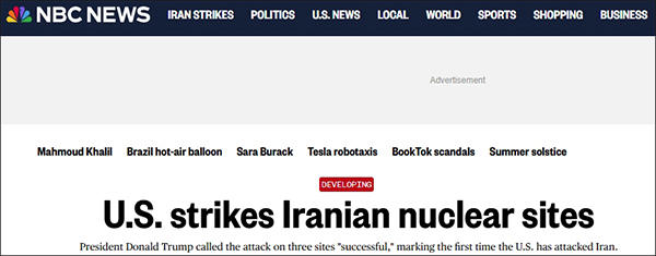 《華盛頓郵報》和美國國家廣播公司(NBC)的頭條標題則為“美國戰機襲擊伊朗核設施”(U.S. warplanes strike nuclear sites in Iran)“美國襲擊伊朗核設施”(U.S. strikes Iranian nuclear sites)。