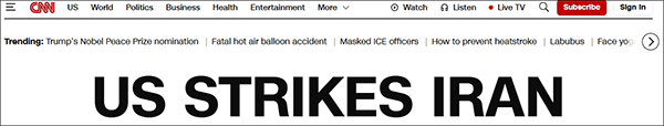 美國有線電視新聞網(CNN)頭條以“美國襲擊伊朗”(US STRIKES IRAN)為題。