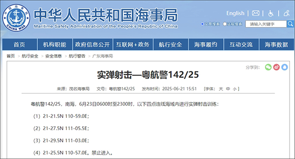 航行警告:南海部分海域進行實彈射擊訓練,禁止進入 guancha 2025-06-22 據中國海事局網站消息,茂名海事局6月21日發佈航行警告稱,6月23日6時至23時,南海部分海域進行實彈射擊訓練,禁止進入。