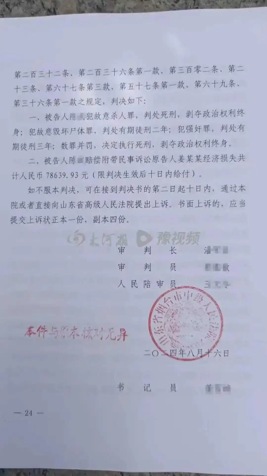 2024年8月16日,山東省煙台市中級人民法院一審判決:被告人陳某犯故意殺人罪,判處死刑,剝奪政治權利終身;犯故意毀壞屍體罪,判處有期徒刑二年;犯強姦罪,判處有期徒刑三年;數罪併罰,決定執行死刑,剝奪政治權利終身。被告人陳某賠償附帶民事訴訟原告人姜某某經濟損失共計人民幣78639.93元(限判決生效後十日內給付)。