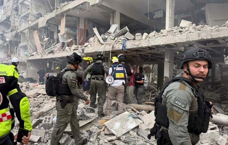 6月22日,以色列中部遭受導彈襲擊現場,部分建築坍塌,救援人員開展工作。 視覺中國