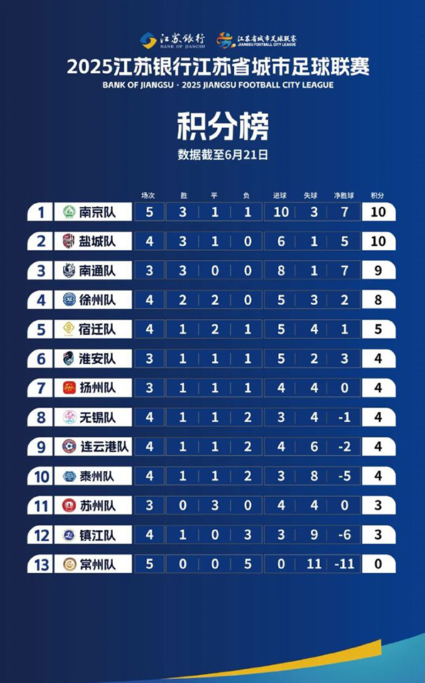 “蘇超”最新積分榜來源:江蘇城市足球聯賽