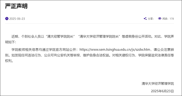 清華大學經濟管理學院網站6月23日發佈嚴正聲明。