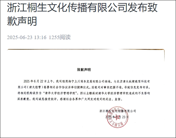 該公司表示,6月22日上午,該公司租用海寧上川商務發展有限公司場地,與北京清大縱橫教育科技有限公司(清大經管)簽署相關合作協議並舉行授牌儀式。因該公司對事實把握不準,導致信息發佈有誤,將相關機構誤作為“清華大學經濟管理學院”。因以上錯誤對清華大學經濟管理學院造成的不良影響深表歉意,該公司誠懇接受批評,感謝社會各界和廣大網友關注、監督。